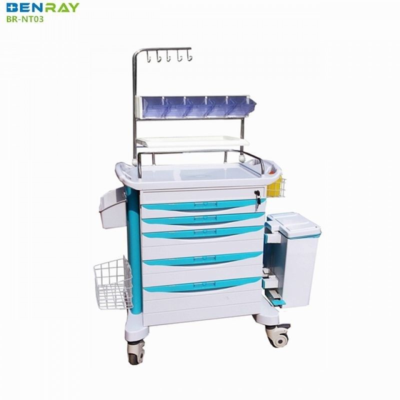 1) Grootte: 780*475*920 mm 2) Eén stuk ABS-plastiek topbord met booghandgreep en opgeheven randontwerp, bedekt met transparant zacht plastic glas 3) Stainless steel beveiligingsrail,multi-bin container ((een enkele rij) 4) Grote stofmandje (volume: 35L), opslagdoos, opslagmandje, naaldverwijderingshouder 5) Vijf laden: 2 kleine laden, 2 middelste laden en 1 grote laden (elke binnenste laden met afschermingen kunnen vrij in verschillende grootte eenheden worden georganiseerd) 6) Vier luxe geluidsvrije rollen (twee met remmen) 7) Hoogwaardige kunststof-staalkolommen 8) Etikettenkaarten voor laden