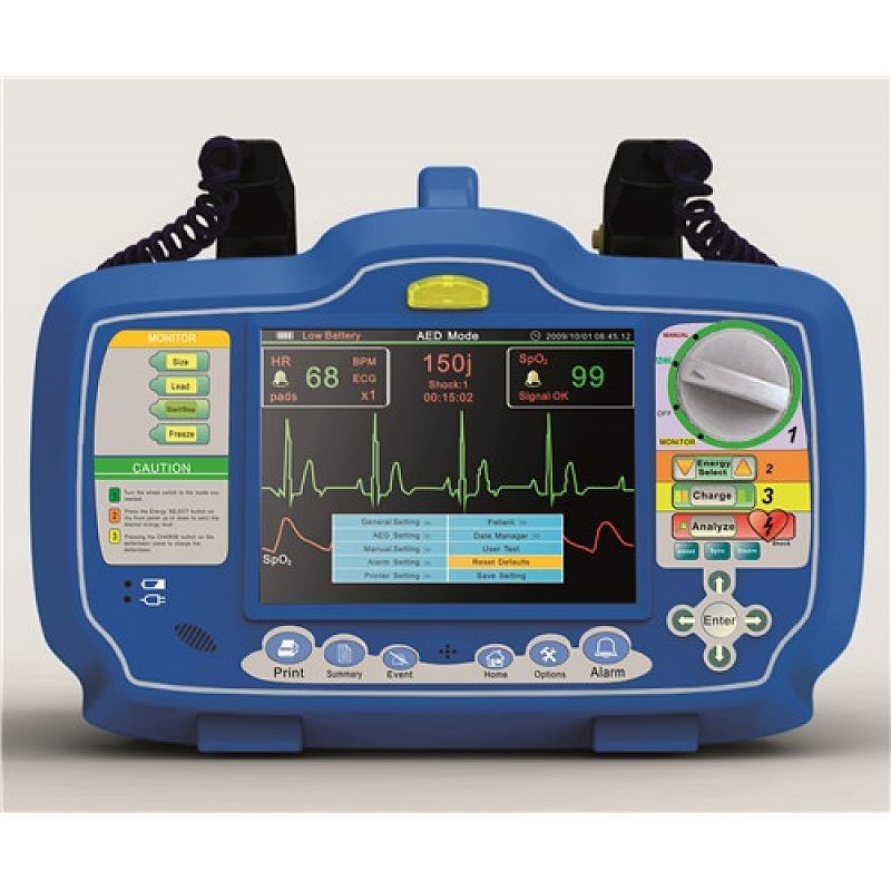 Specificaties 1.B.iphasische defibrillator 2AED, handmatig, monitor, deze drie modus 3Eenvoudige operatie. 4. CE, ISO-certificaat 5.NI-MH batterij Afbeelding: Displaytype: 7 inch hoogresolutioneel lcd-display Defibrillator: Golfvorm: Bifasisch ECG-monitoring: Patiëntverbinding: 5-lead EKG-kabel, of 3-lead EKG-kabel, paddels.
