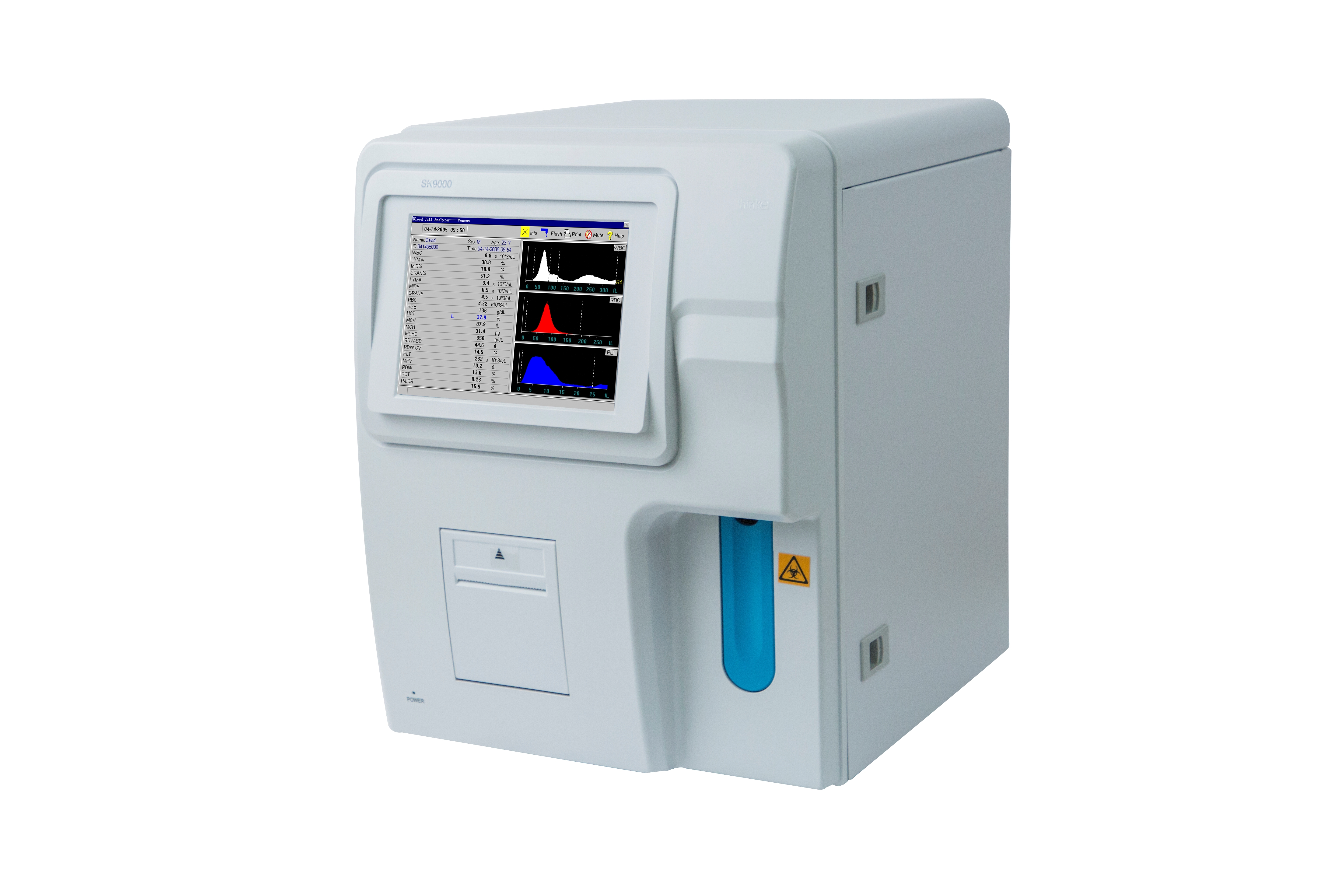 Parameter: 3-delige differentiatie van WBC; 20 parameters en 3 kleurenhistogrammen (WBC, RBC, PLT)
