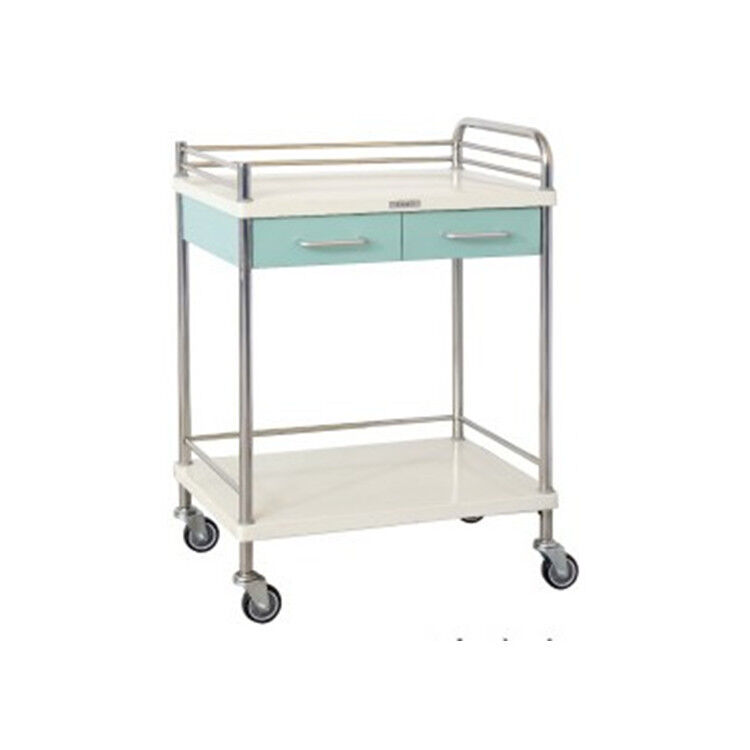 Hoogwaardige roestvrijstalen kliniek trolley ontworpen voor gebruik in ziekenhuizen en medische faciliteiten.en vier wielen met kruisremmen voor stabiliteit en mobiliteit.